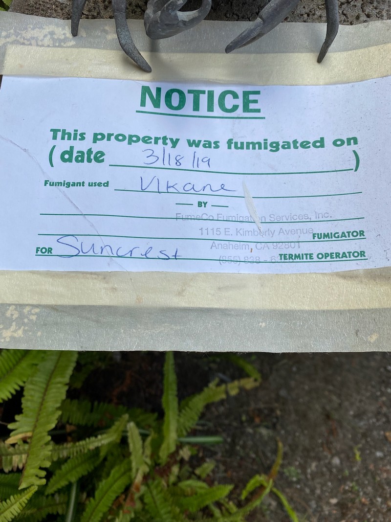Building was tented and treated for termites by Suncrest 714-632-3600, but the work was done by FumeCo Fumigation (Google says they're permanently closed).